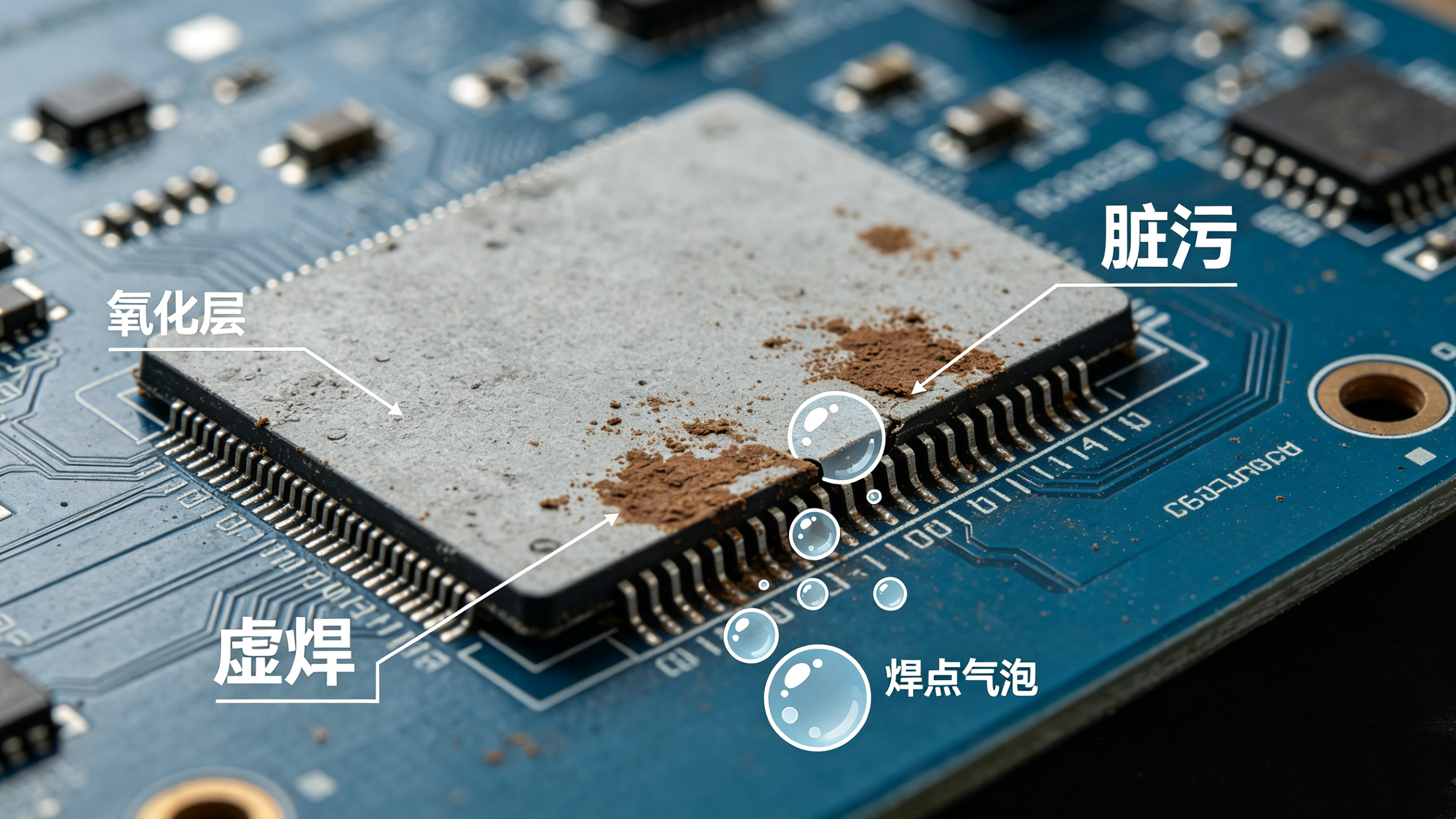 最直接且最致命的影响,是导致焊接缺陷频发,直接降低生产良率,增加生产成本。焊接的核心是焊料与焊盘金属形成稳定的冶金结合层(IMC),而氧 化膜和脏污会直接阻碍这一过程的发生。对于氧化焊盘而言,表面的氧化层(如氧化铜、氧化锡)属于绝缘体,会隔绝焊料与焊盘基材的接触,导致焊料无法润湿焊盘——要么出现“拒焊”现象,焊锡像水珠在荷叶上一样收缩成球状,无法形成有效连接;要么形成“虚焊”“冷焊”,焊锡看似包裹住焊盘和元件引脚,但实际上未形成牢固的冶金结合,连接强度极低。这种缺陷在生产过程中难以通过常规检测完全排查,往往会流入后续环节,甚至到客户端才暴露问题。